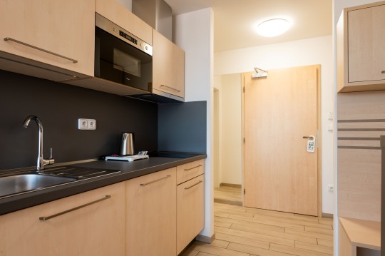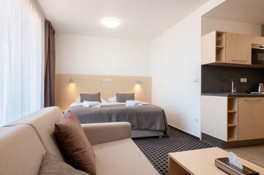 Prostorné studio COMFORT nabízí velkou postel, rozkládací pohovku s plnohodnotnými lůžky, TV, šatní skříň, konferenční stůl a jídelní kout. Kuchyňský kout je vybavený vším, co budete potřebovat nejen k uvaření kávy, čaje, ale i chutného oběda. Samostatný balkon s posezením. Sociální zařízení se sprchovým koutem, hygienickými potřebami, ručníky, fénem a WC.